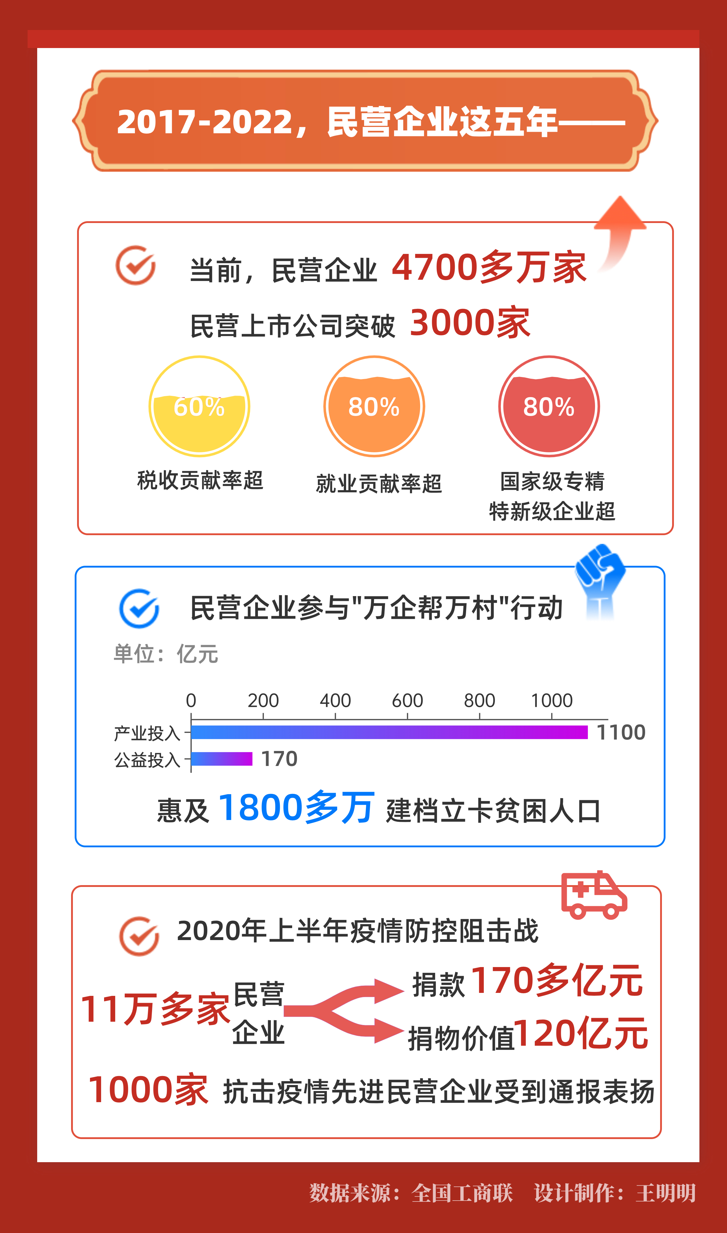 各級工商聯(lián)精心組織,12.7萬家民營企業(yè)精準(zhǔn)幫扶13.91萬個村(其中建檔立卡貧困村7.32萬個);產(chǎn)業(yè)投入1105.9億元,公益投入168.64億元,安置就業(yè)90.04萬人,技能培訓(xùn)130.55萬人,共帶動和惠及1803.85萬建檔立卡貧困人口。